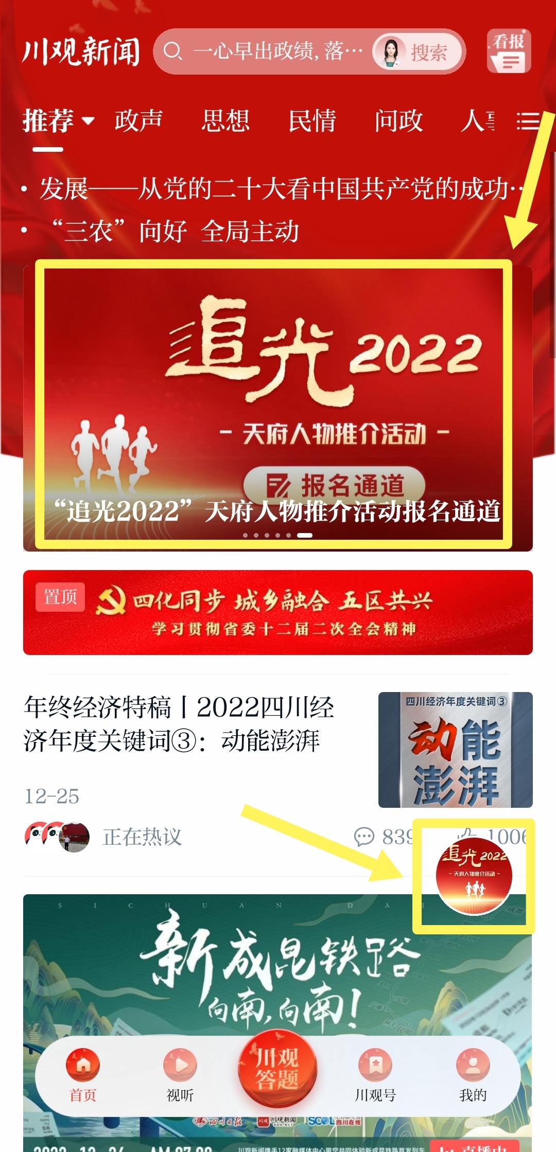 1、登录川观新闻客户端,点击上方“追光2022”天府人物推介活动报名通道,或点击右侧悬浮球进入报名通道。