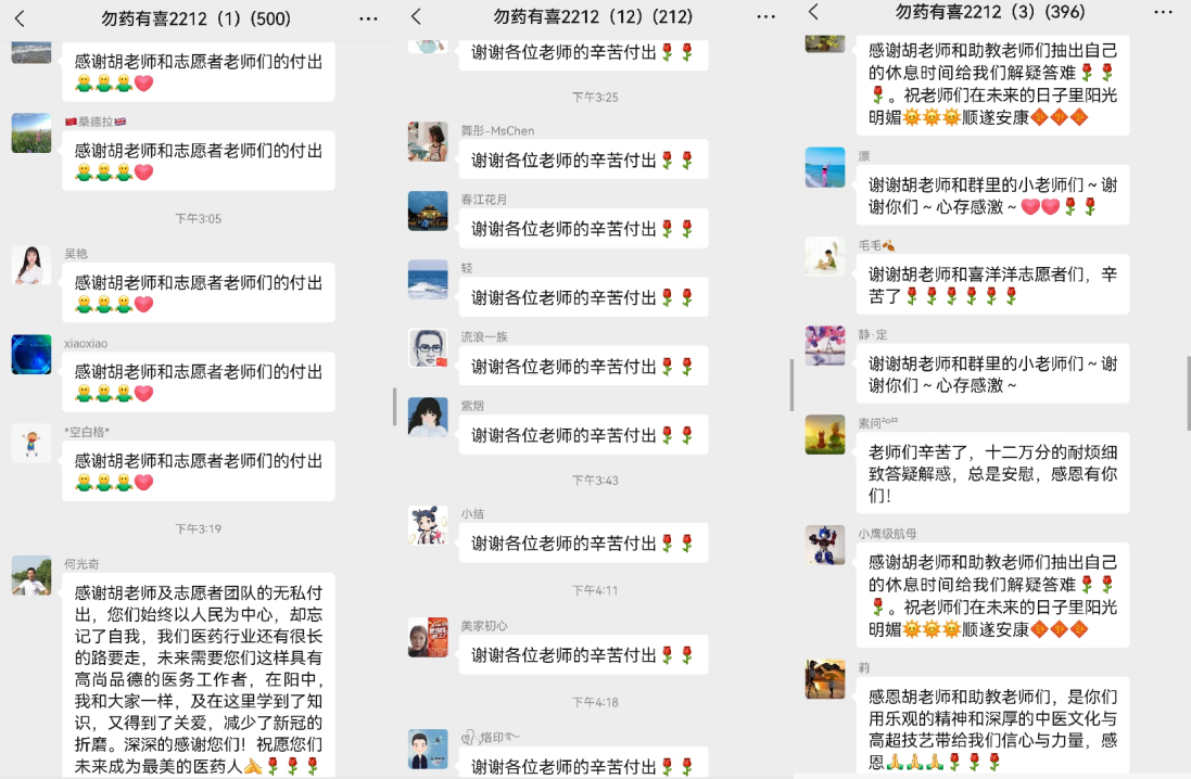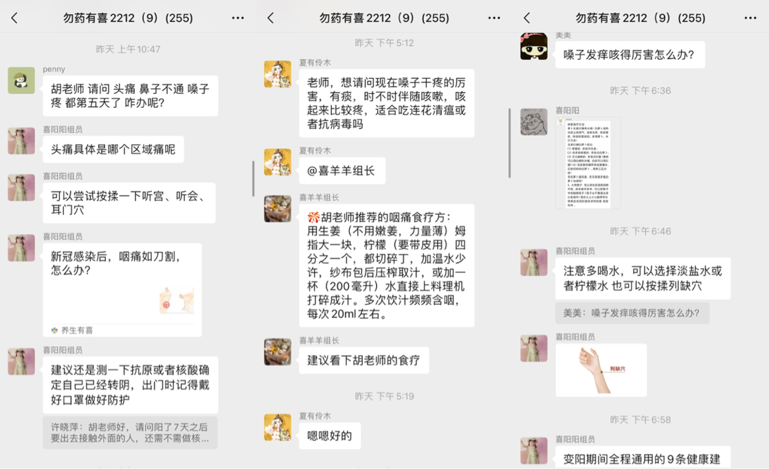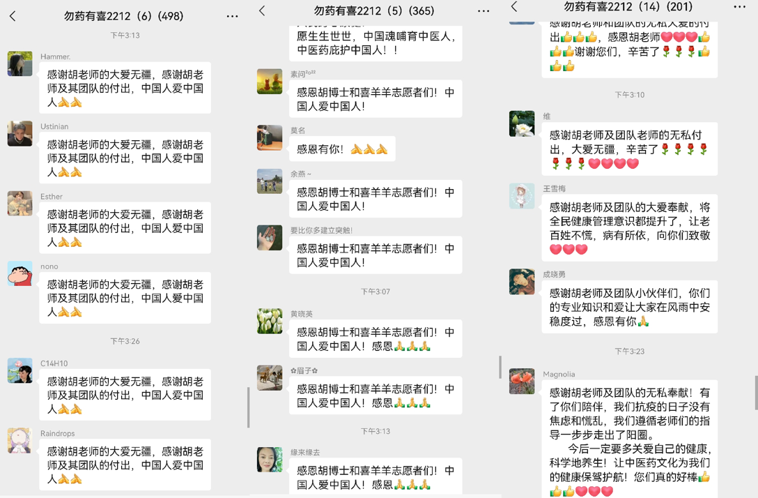 在两周的志愿服务行动里,团队组建的“勿药有喜”微信群成为了主战场。60余名中医药专业志愿者们在17个微信群里,持续为近6000名有症状感染者及其家庭提供医学咨询和健康指导服务,并通过微信公众号、视频号直播等形式,直接间接服务万余人。