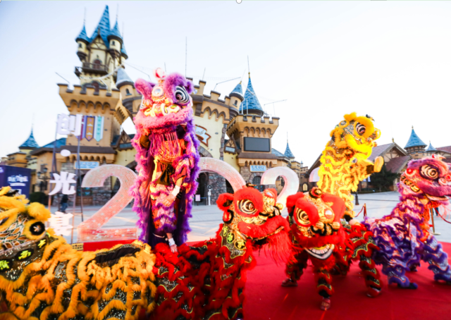 开幕当天,融创乐园正门口举行了灯光节亮灯仪式。来自童话王国的精灵与仙子欢歌载舞,舞狮、夜的礼赞、大湖秀、打铁花等精彩节目,轮番将仪式推向一个又一个高潮……万盏灯火交相辉映,一个具有“烟火气”的乐园在夜晚华丽登场。