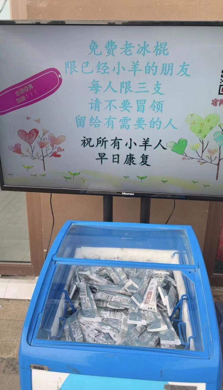 近日,一段感染者免费领取老冰棍的视频在网络热传。视频中,一液晶电视显示着“免费老冰棍,限已经感染的朋友,每人限领三只,请不要冒领,留给有需要的人”,而置于电视下的正是一冰柜的老冰棍雪糕,录视频的男子嘴里说着,“有需要的可以过来领取,我直接把冰柜放在门口,你们来直接拿就行。”
