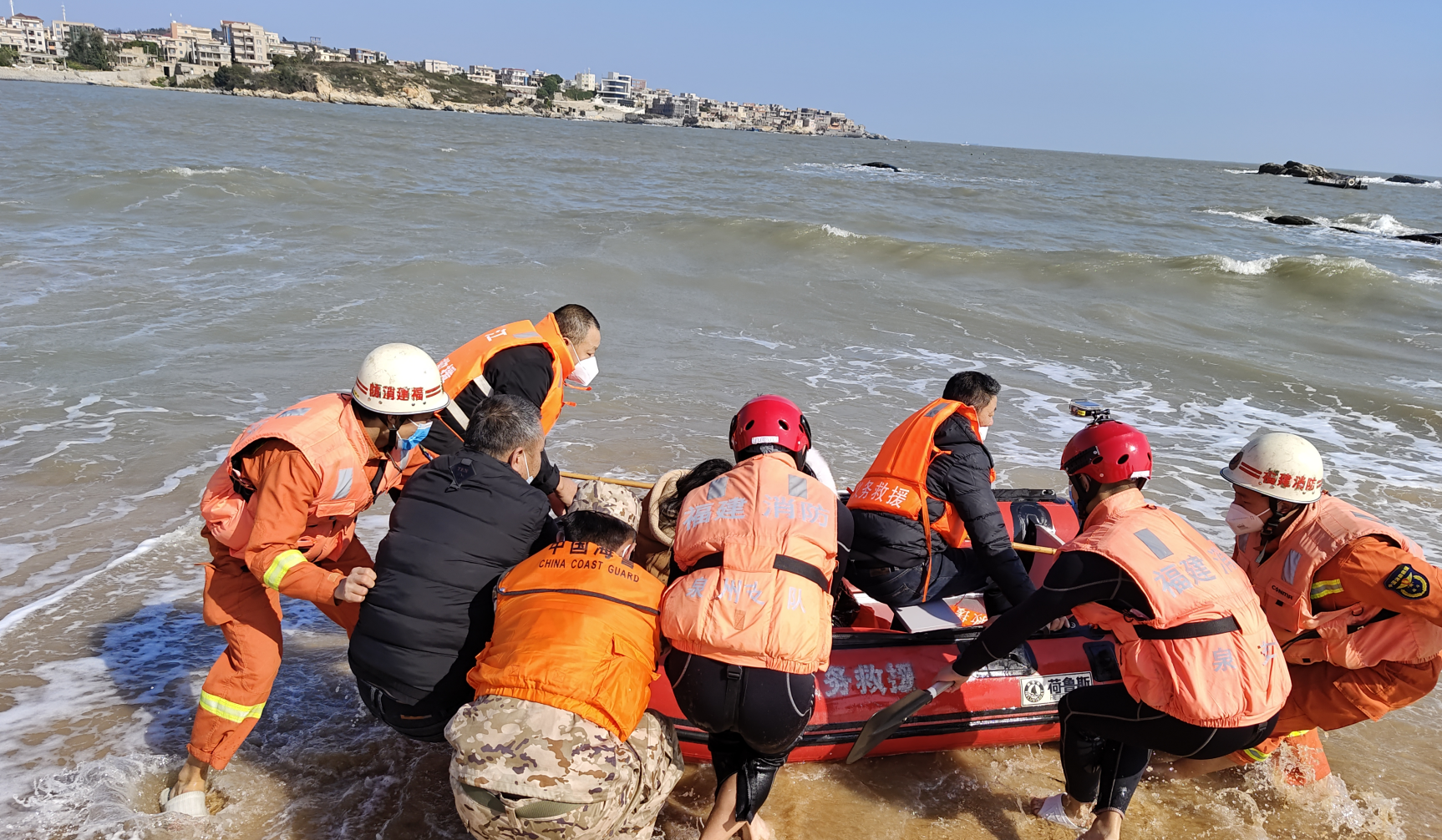 接警后,泉州海警局晋江工作站立即启动应急救援预案组织人员携带救生设备前往现场救援,并将警情通报给相关涉海部门。到达现场后,出警人员联合现场各部门及救援力量开展情况研判,当时虽为正午,但气温仅为10度,风力达到6至7级,且正处涨潮期间,如不及时施救,礁石随时有被淹没的危险,危及游客生命安全。该站立即联合晋江消防、深沪海防派出所、晋江市义务救援协会通过小型皮划艇前往救援,经过近一个小时的紧急救助,被困人员被转移至安全地带。