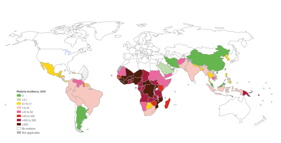 2018年不同国家每1000名高危人群中的疟疾发病数(来源:世界卫生组织)。