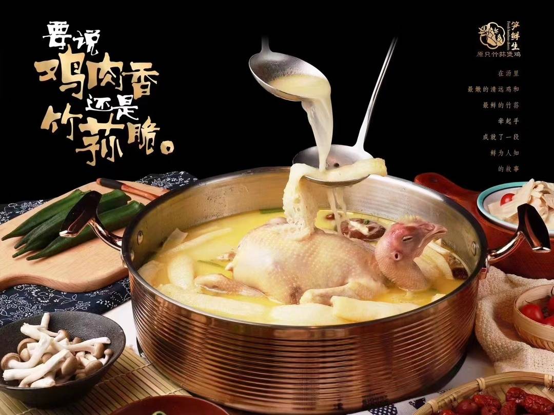 笋鲜生,其鸡汤每天现熬,慢火熬煮7小时,汤底呈乳白色,喝起来特别鲜。其竹荪汤锅里还有各类笋,味道清新脆嫩,十分鲜美。