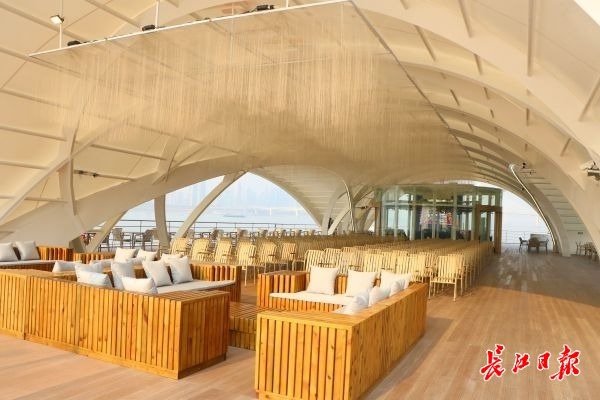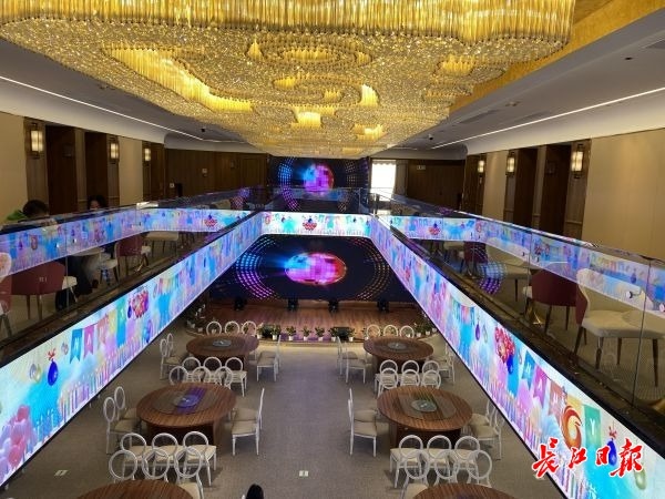 长江日报记者步入船中,映入眼帘的是一楼可容纳22桌的宽敞宴会大厅。船首宴会舞台配备大型LED电子屏与音响设备,能满足各种高端婚宴、商务需求。船两侧为通透式玻璃幕墙,在宴会的同时也能兼顾欣赏两江四岸美景。一二楼之间镂空天井有环绕式LED电子屏,正播放着视频、图片等;天花板龙凤造型的水晶灯华丽夺目,寓意龙凤呈祥。二楼游客也能通过天井俯瞰宴会场景,围绕天井的一圈卡座给游客提供更舒适的观看环境。二楼装修为新中式风格,共设有16个VIP主题包房,分别以古代婚嫁“六礼”的“纳采”“问名”“纳吉”“纳征”“请期”“亲迎”等命名,各具特色。每个包房都配有独立电视,可与一楼主LED电子屏实现同步播放。还有8个包房拥有独立的观景阳台,为游客提供更私密聚会空间。