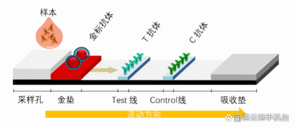 据生命时报报道,抗原检测盒里面有多层试纸,抗体1分布在试纸最前端的金垫上,而且可以移动,抗体2固定在检测线(T线)部位,抗体3固定在质控线(C线)部位。当溶液滴到试纸上时,由于毛细现象,溶液会从左到右逐渐布满整个试纸。