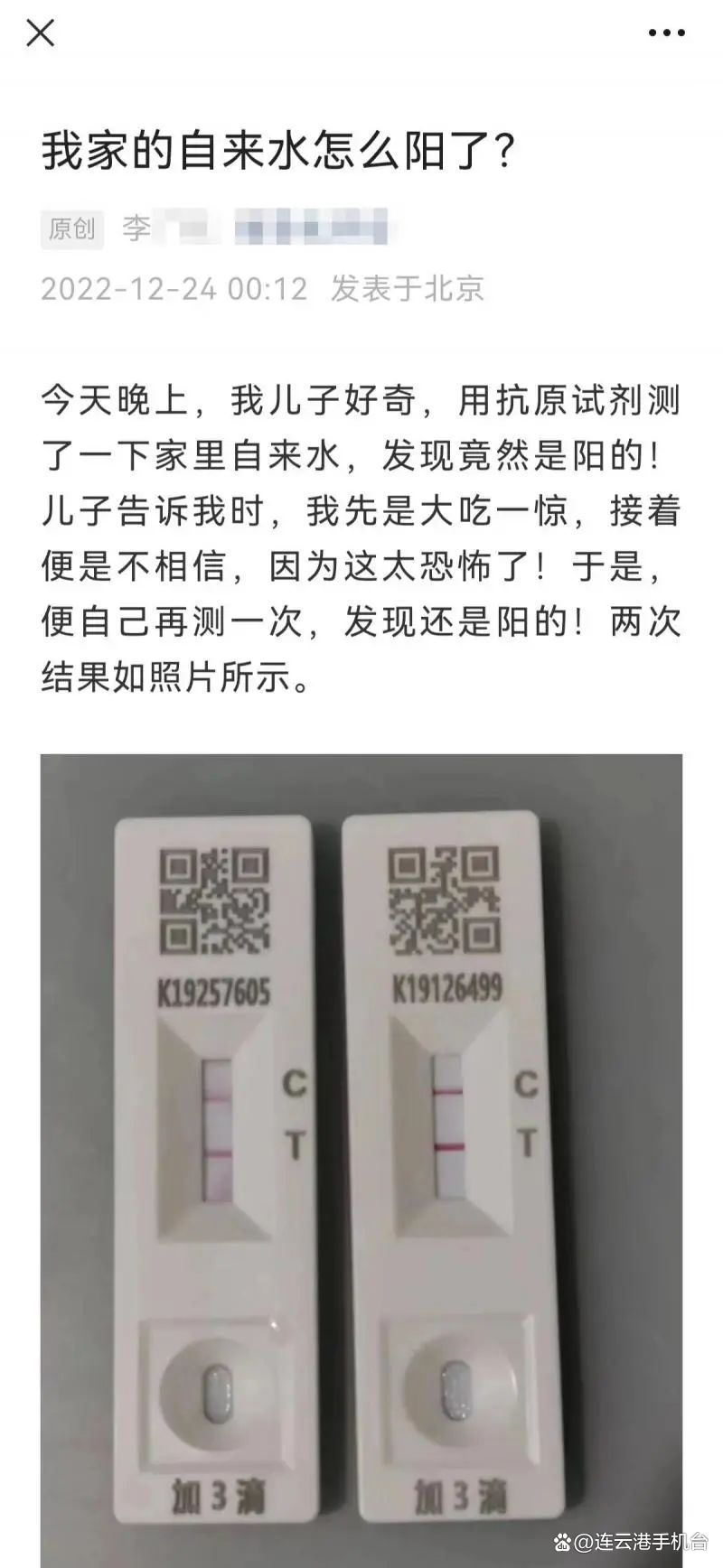 该公众号文章称,先用抗原试剂自带的滴管装入自来水,然后再将其滴入抗原测试板上,测试结果呈现“两道杠”,从而得出“自来水阳了”的结论。