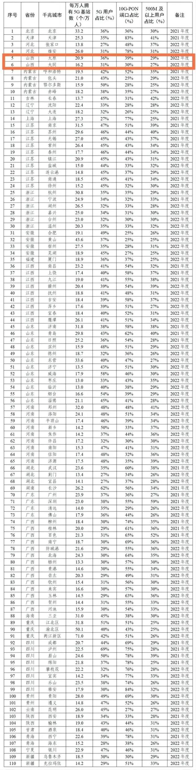 工业和信息化部日前通报2022年千兆城市建设情况,目前全国共有110个城市达到千兆城市建设标准,太原和大同两市成功上榜。