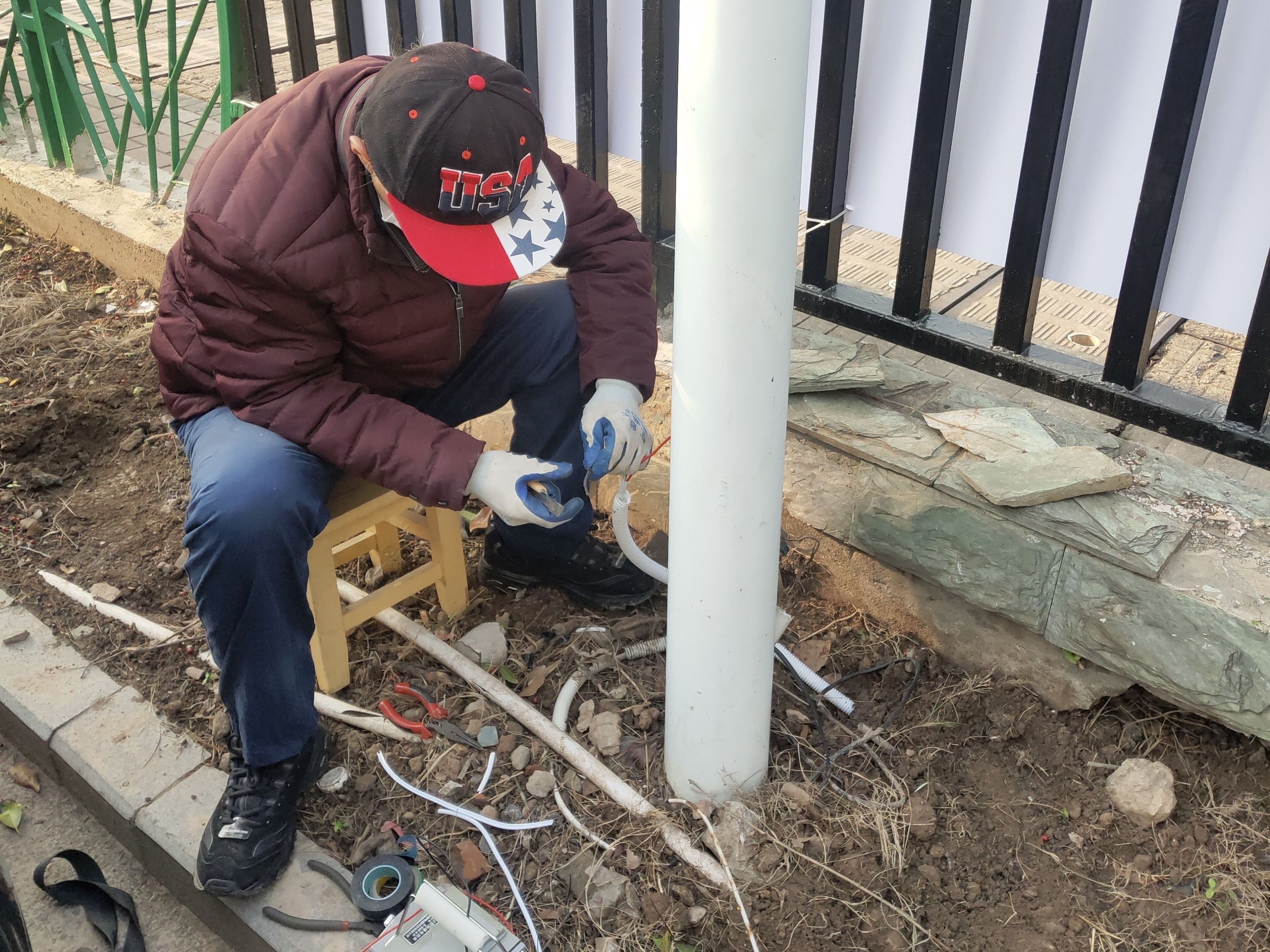 物业工作人员正在为增设路灯布线穿管。通讯员供图