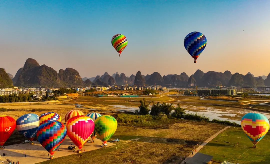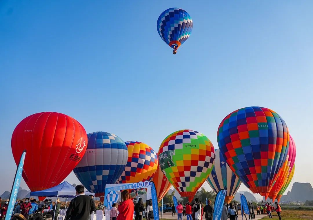 12月24日,2022年广西热气球挑战赛在阳朔燕莎航空运动营地开幕,来自全区的10支热气球队欢聚在美丽的桂林山水间,在云端展开激烈角逐。据悉,此次热气球挑战赛由自治区航空运动管理中心、广西航空运动协会主办,是广西首届热气球挑战赛。