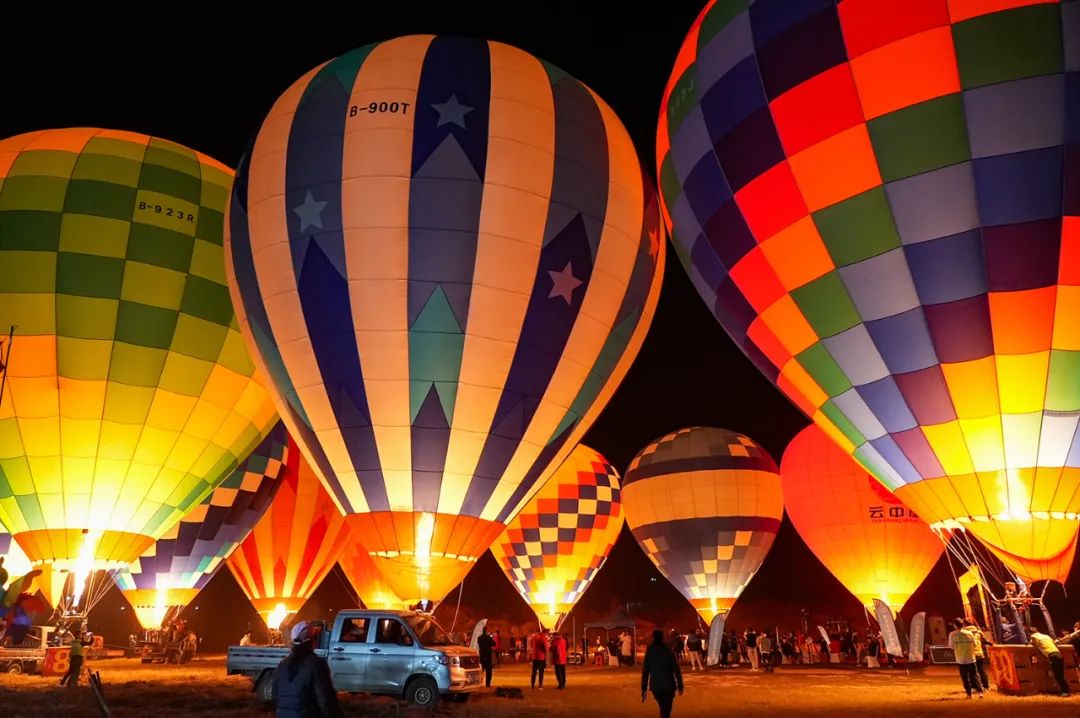 在当天的开幕式上,伴随着动感的音乐 10支20多米高的热气球点火缓缓升空,在阳朔山水间为大家带来精彩的飞行表演。五颜六色的热气球映衬着桂林的山水风光更显迷人,引得众多游客驻足观看,大家纷纷举起相机拍摄这美丽瞬间。随着夜幕降临,热气球灯光秀热烈上演,10支热气球围拢在一起,依次喷吐着火舌,伴随着美丽的烟火表演,将冬日的夜空点亮,给人们带来独特的体验。