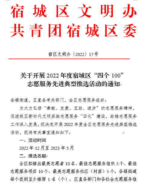 为大力弘扬“奉献、友爱、互助、进步”的志愿服务精神,促进我区新时代文明实践志愿服务“四化”建设,助推志愿服务工作深入发展,现决定开展2022年度全区志愿服务先进典型推选活动。