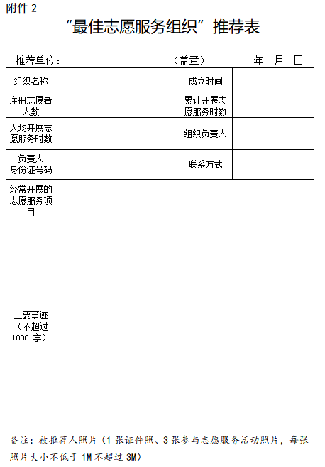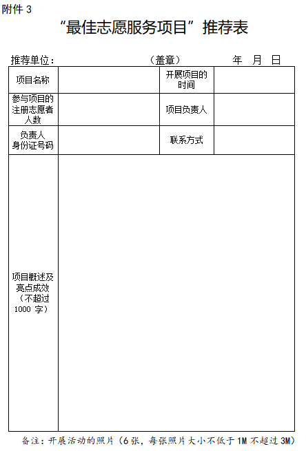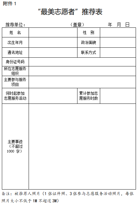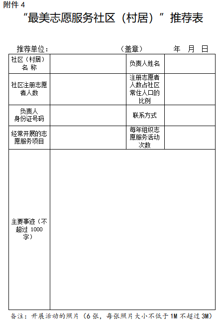 各推荐单位填写推荐表(附后),最美志愿者提供证件照1张和开展志愿服务的照片3张,最佳志愿服务项目、最佳志愿服务组织、最美志愿服务社区(村居)提供活动现场照片6张(照片不需要插入Word中,直接放入文件夹打包发送,照片大小不低于1M不超过3M),以上材料请于2023年1月31日前将电子版发至电子邮箱scqwmbxjz@126.com,发送标题标注“四个100”+个人、+组织、+项目、+社区(村居)字样。推荐表纸质版加盖公章后统一报送至区文明办宣教组。