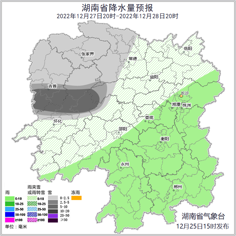 27日20时至28日20时,湘中、湘北阴天有雨夹雪或雪,其中常德南部、湘西州南部、怀化中北部、益阳西部、娄底西部部分中雪,局地大到暴雪,其他地区多云转阴天有小雨;北风4~5级;最高气温湘西、湘北4~6℃,湘南8~10℃,其他地区2~4℃;最低气温湘南2~4℃,其他地区0~2℃。