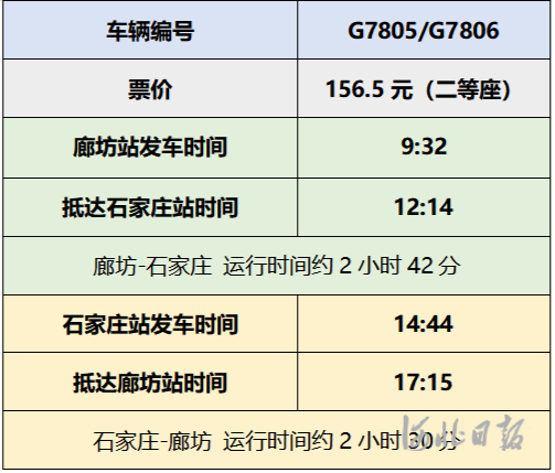 据悉,廊石高铁直通车编号G7805/G7806,早9:32从廊坊站始发,经天津西站后走行津保铁路、京广高铁,12:14到达石家庄站,运行时间约2小时42分,13:02终到邯郸;此后返程,14:36到达石家庄站,14:44开,17:15到达廊坊站,运行时间约2小时30分。列车至石家庄单程运行里程约354公里,二等座票价为156.5元。