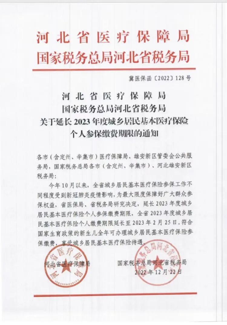 今年10月以来,全省城乡居民基本医疗保险参保工作不同程度受到新冠肺炎疫情影响,为最大限度保障好广大群众参保权益,省医保局、省税务局研究决定,延长2023年度城乡居民基本医疗保险个人参保缴费期限,全省2023年度城乡居民基本医疗保险个人缴费期限延长至2023年2月25日。符合国家生育政策的新生儿全年可办理城乡居民基本医疗保险参保缴费,享受城乡居民基本医疗保险待遇。