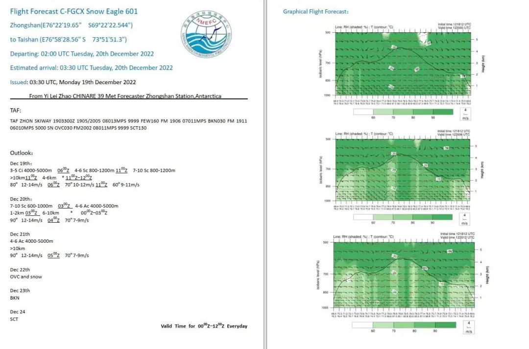 接到首次飞行任务后,我中心在前期做了大量的准备工作。海洋气象预报室后方保障人员收集各类文献、历史数据,开展了针对泰山站和中山站所处的东南极区域的气候背景分析工作。面对航空气象这个全新领域,搜集大量资料,明确了未来工作中的重点关注要素,如机场云量、能见度、航线颠簸程度等,并着手制作重点要素预报产品。此后,后方人员提前7天启动气象会商,并邀请了中国民航气象中心的专家,一同分析天气形势,结合多家数值预报结果,为首飞寻找窗口期。最终确定建议固定翼飞机队于16日进行试飞工作,同时后方启动逐日会商工作机制,每天为前方保障团队提供最新数值预报资料以及最新会商意见。