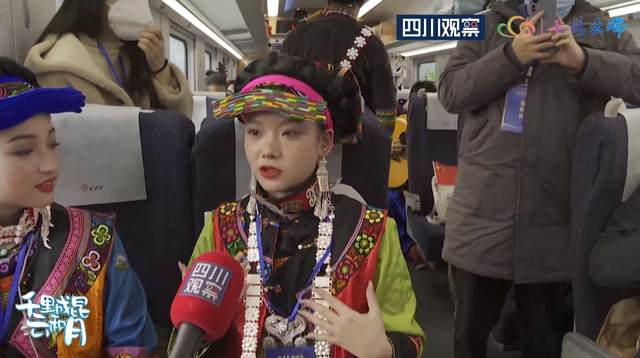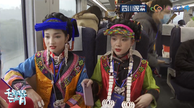 直播中,四川观察记者徐芸倩在新成昆线首发列车上遇到了两位身着传统彝族服饰的小姐姐,她们为我们在线科普了传统彝族服饰的搭配讲究。