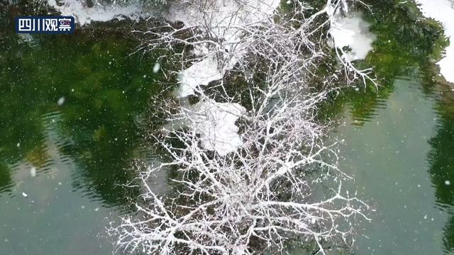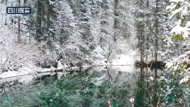 12月25日,四川阿坝松潘境内大范围降雪。松潘古城二道海景区,雪花似鹅毛飘舞,将整个景区妆点成童话世界。在雪花的映衬下,二道海像一颗绿宝石镶嵌在雪中。整个森林披上雪白霓裳,变身林海雪原,分外妖娆。
