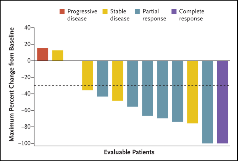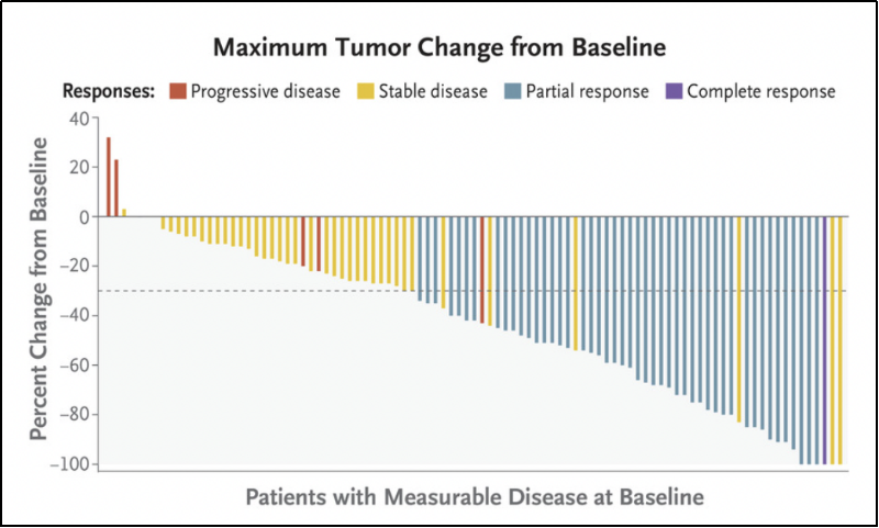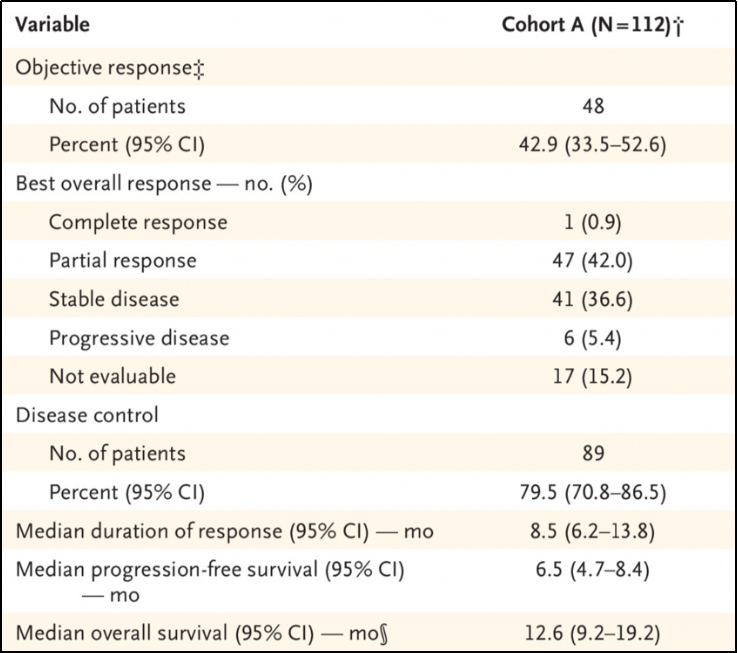 截至中位随访时间为12.9个月(95%CI, 11.8-13.5)时,112例基线可测量患者的ORR为42.9%(95%CI, 33.5%-52.6%)。见图1-A。