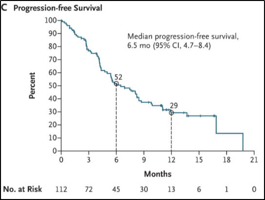 112例可评估患者的中位PFS为6.5个月(95%CI, 4.7-8.4),6个月和12个月的PFS率分别为52%和29%。见图1-C。
