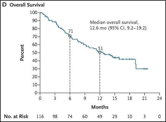 中位随访时间至15.6个月时,中位OS为12.6个月(95%CI, 9.2-19.2),6个月和12个月的OS率分别为71%和51%。见图1-D。