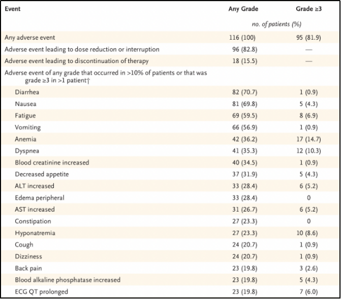 接受治疗的116例患者均发生了不同程度的不良事件,其中113例患者与治疗相关(TRAE);