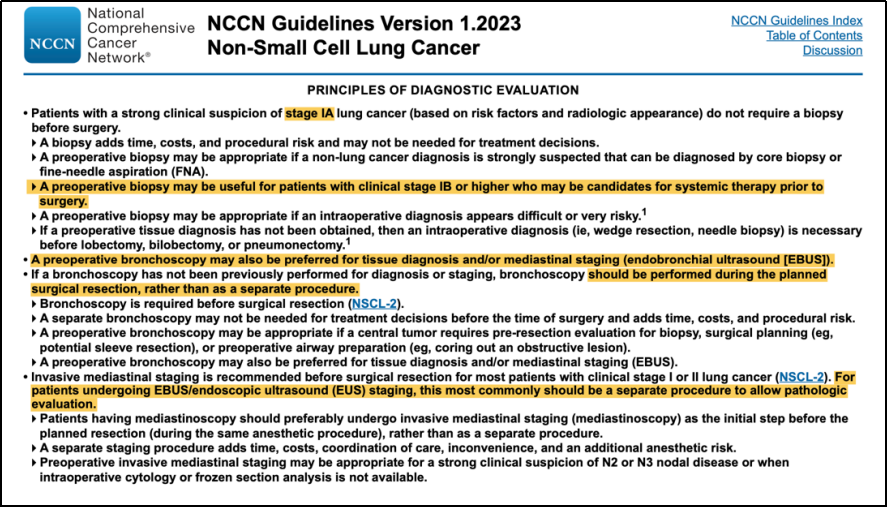 以往指南中表明,临床高度怀疑为“I/II期肺癌“的患者(基于风险因素和影像学表现),术前无需活检。新版指南中已将无需术前活检的范围精准到“IA期肺癌”患者。