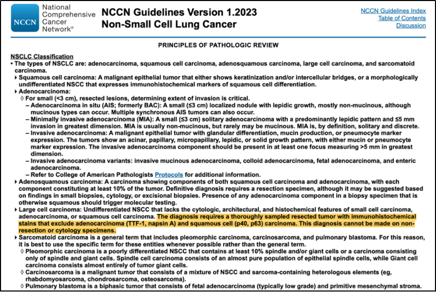 本次指南更新,明确表明除了要对切除的肿瘤组织彻底取样外,还需进一步行免疫组化染色,以排除腺癌(TTF-1、napsin A)和鳞状细胞(p40、p63)癌。