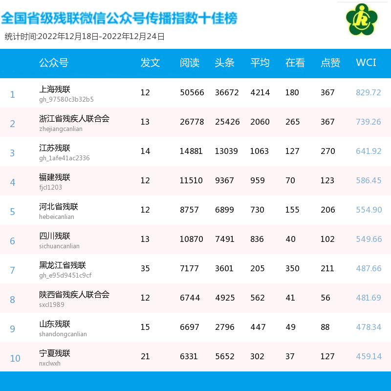 本周十佳榜上,发文数、在看数最高为黑龙江省残联,总阅读数、头条阅读数、平均阅读数最高为上海残联,点赞数最高为上海残联和浙江省残疾人联合会。