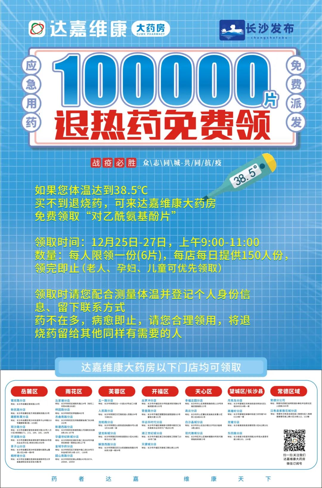 达嘉维康大药房积极协调,紧急调度了10万片“对乙酰氨基酚片”,12月25日-27日在部分门店免费提供。
