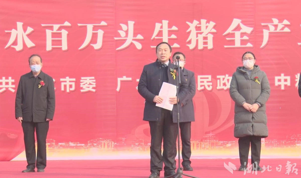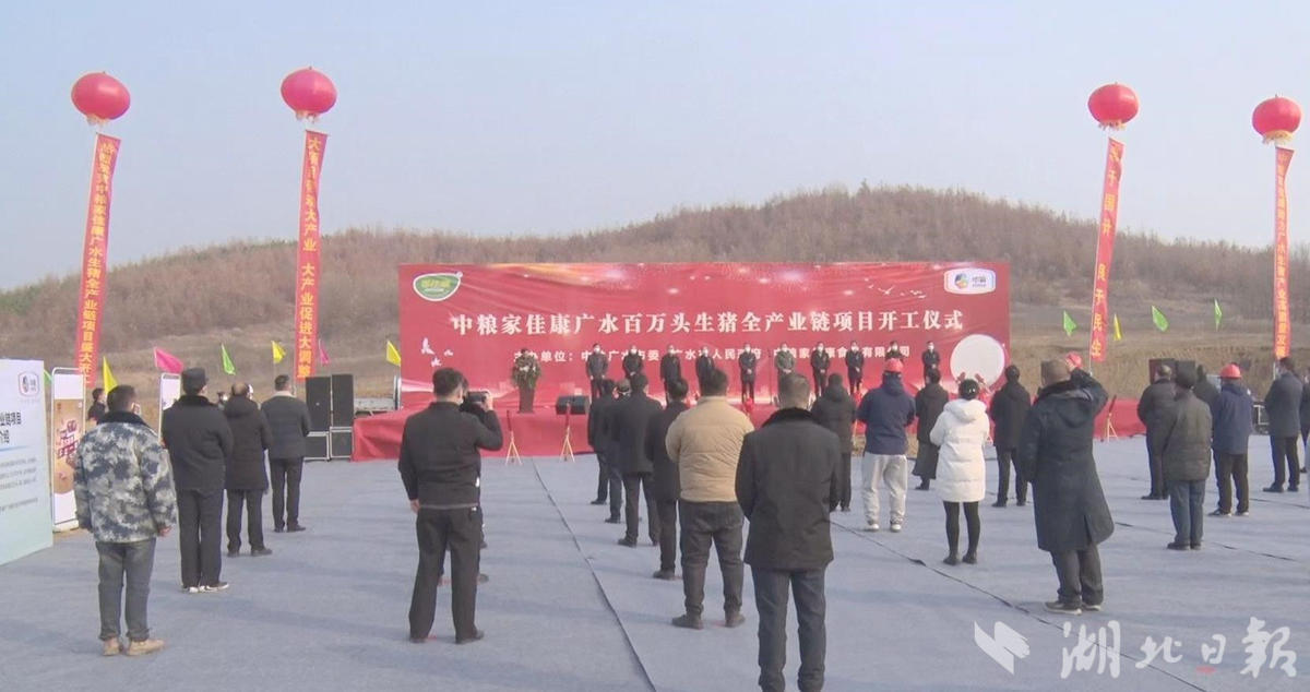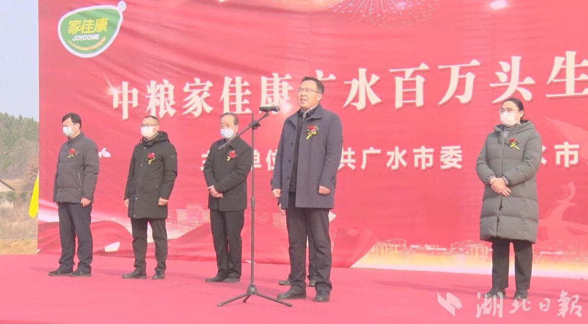 随州市副市长徐锋宣布项目开工,广水市委书记杨光胜致辞。随州市发改委主任汪海涛,随州市农业农村局局长胡建鄂,广水市市长崔传金,市委副书记、市委政法委书记张杰,市委常委、常务副市长梁晗鹍,副市长方国全,中粮家佳康食品有限公司养殖部总经理倪素珍出席开工仪式。崔传金主持项目开工活动。