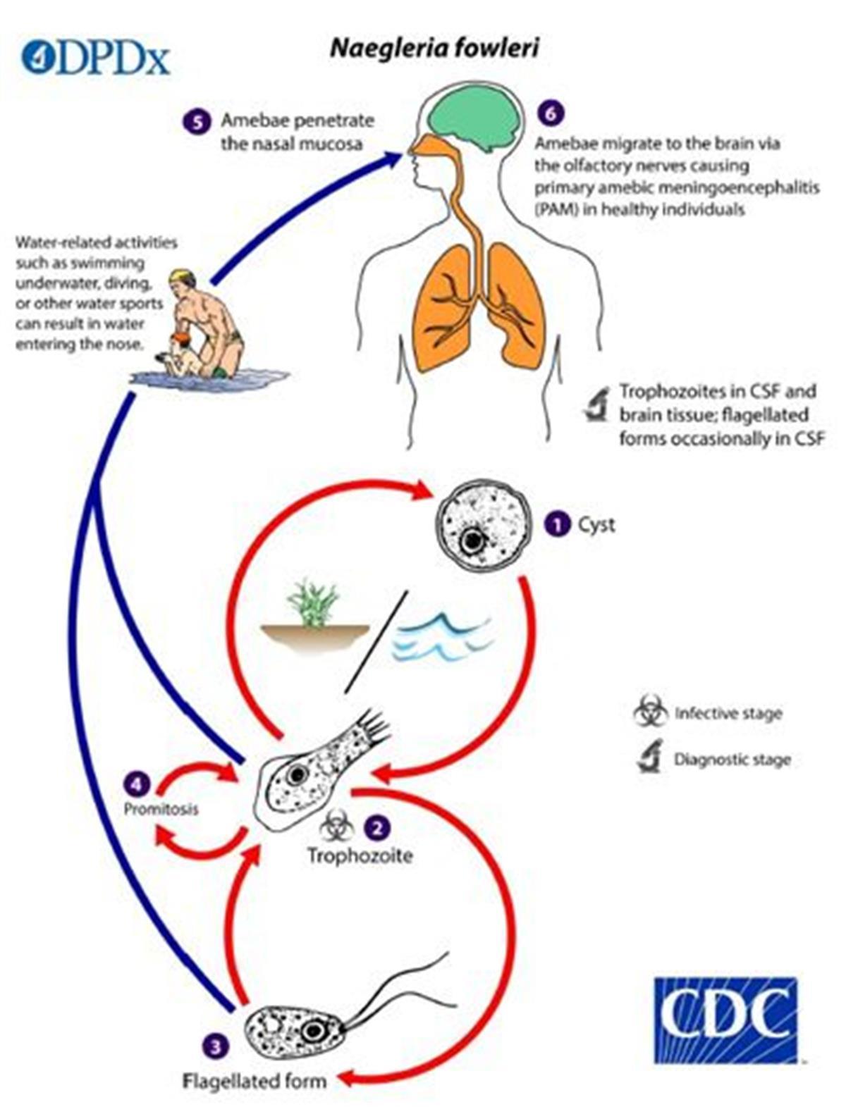 该原生动物穿过鼻子并沿着嗅觉神经到达大脑,潜伏期短则2至3天,长则7至15天,感染初期可出现头痛、精神错乱、嗅觉和上呼吸道等症状。随着感染的发展,头痛逐渐加重,可出现发热、呕吐、颈椎强直、昏迷,甚至死亡。