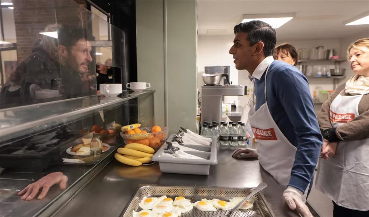当地时间12月23日,苏纳克访问伦敦一个庇护所,亲自为无家可归者提供免费食物。一段视频显示,一名男子到窗口处等待取食,围着围裙的苏纳克先是给他夹了香肠、吐司和鸡蛋,然后将食物递给这名男子。