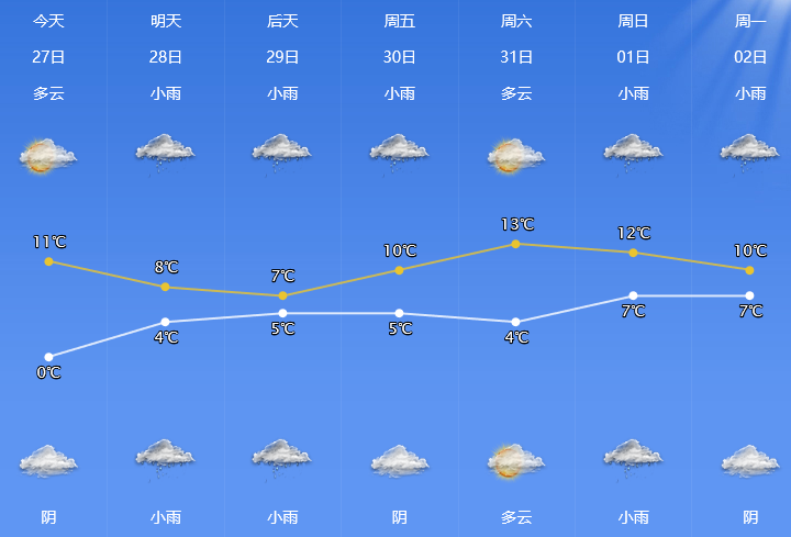至于白天的最高气温,在有阳光的日子里或可窜到10℃及以上,但随着雨滴落下,又将回到最低只有7℃左右。
