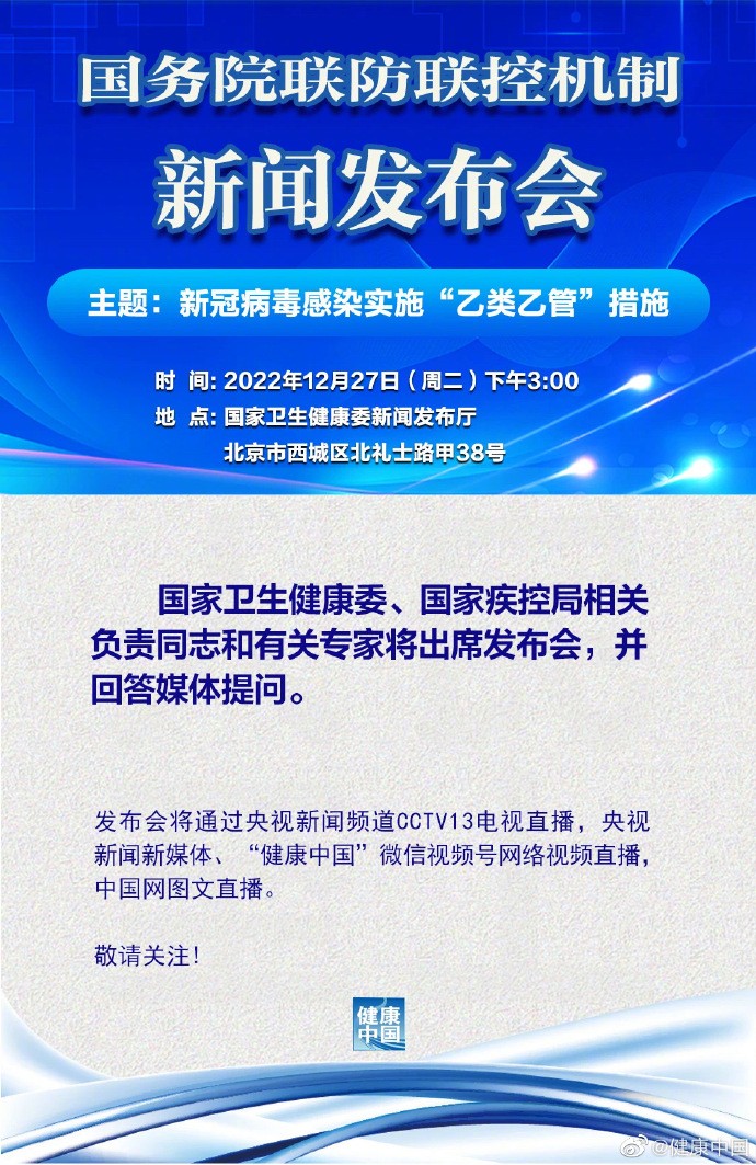 国务院联防联控机制将于12月27日(周二)下午3:00举行新闻发布会,主题为“新冠病毒感染实施'乙类乙管'措施”。国家卫生健康委、国家疾控局相关负责同志和有关专家将出席发布会,并回答媒体提问。