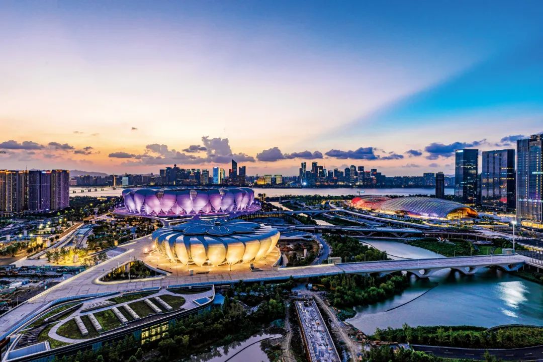 夜幕降临,国网杭州市萧山区供电公司以百分之百的可靠绿电支撑亚运场馆散发绚丽灯光。图/受访者提供