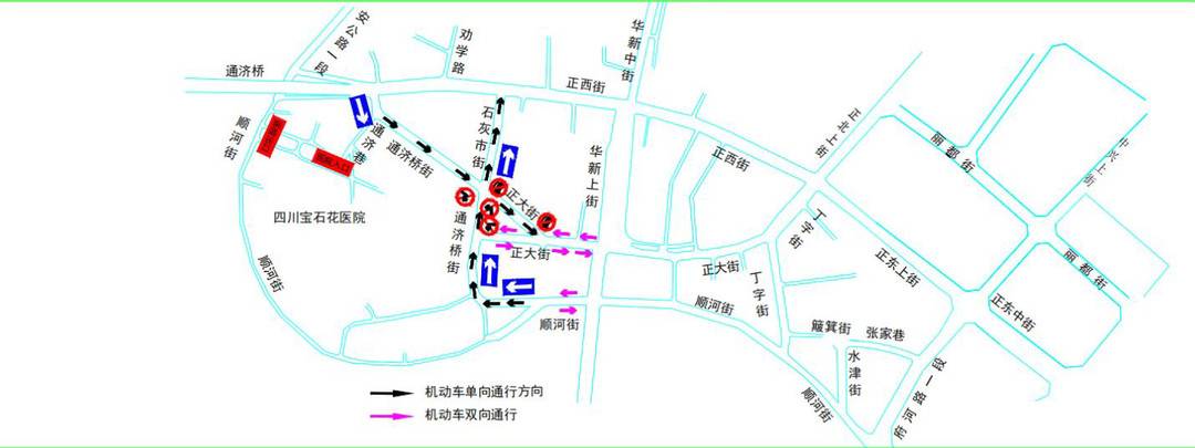 (二)原经通济桥街(顺河街至正大街)由北向南通行的机动车,可通过正大街、益州大道华新上街段、顺河街等道路绕行。
