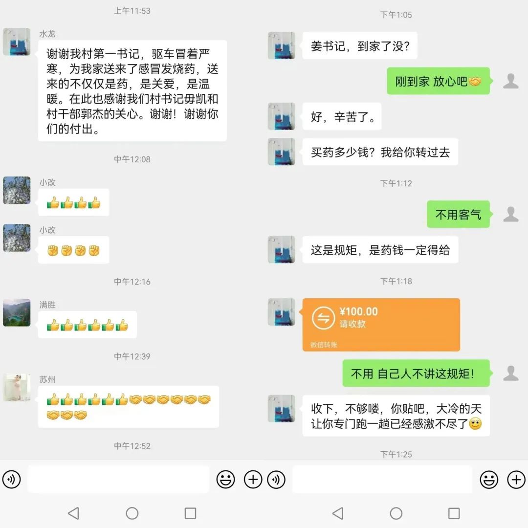 村民拿到药后,激动不已,连声称谢,并给姜军臣微信转款100元请求收下,被姜军臣婉言拒绝。姜军臣为困难群众雪中送炭、救急救难的行为得到了群众一致称赞。