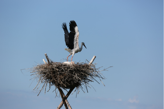 1993年,自然保护区探索开展东方白鹳人工筑巢招引工作,针对东方白鹳喜欢在高大乔木上筑巢繁殖生态学特性,在岛状林中选择适宜的树木开始筑巢招引,并逐渐转移到湿地上木质三脚架招引巢,人工招引繁殖种群数量从几对扩大到二十几对。随着自然保护区对东方白鹳物种研究的深入,保护区的人工招引巢也从木质改进为铁质,设计更合理、更规范。