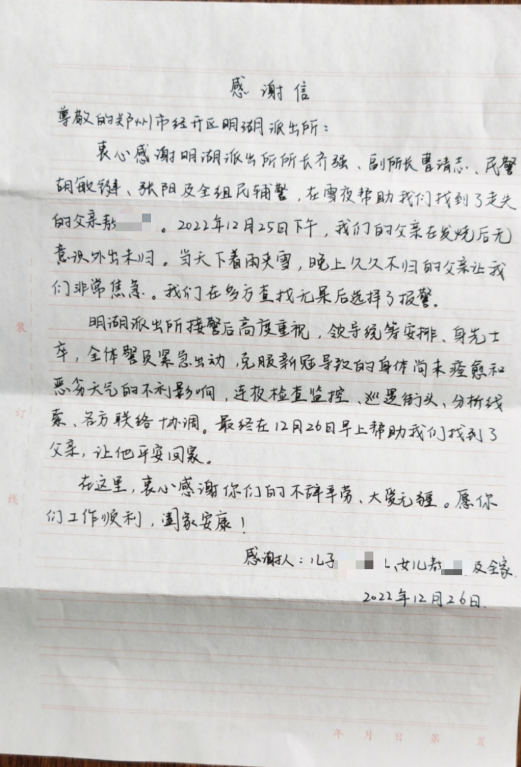 “感谢明湖派出所全组民辅警,在雪夜帮助我们找到了走失的父亲......”敖女士这样写道。
