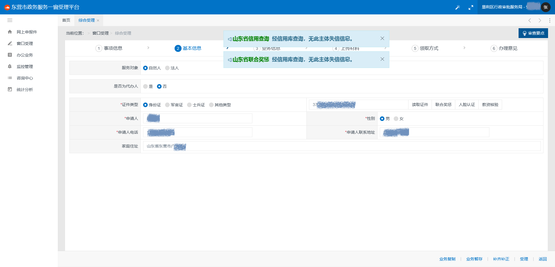 一是全面推行“诚垦分”查询。强化信用信息记录查询在政务服务场景的应用,在垦利区政务服务大厅安装信用查询终端,市场主体可登录“信用中国”网站,自主查询信用报告。将自然人“诚垦分”等级和信用状况直接打印在区政务服务大厅“叫号小票”中,在办理相关事项时,工作人员通过“叫号小票”核查市场主体信用状况,实现“逢办必查”。截至目前,自然人“诚垦分”等级和信用状况打印次数达70余万次。二是全领域实现“联合奖惩”“信用核查”查询。目前,垦利区政务服务大厅“一窗受理”窗口在业务受理环节,通过东营市“一窗受理”平台可自动实现信用信息查询和信用“联合奖惩”信息查询,通过查询申请人联合奖惩数据记录和申请人信用信息,对信用等级高的企业或个人,缩短审批时限,加快业务办理,做到政务服务申请人信用信息“应查必查”。三是推行信用承诺提升企业开办便利度。在市场准入服务窗口推行企业信用承诺制,企业在办理企业登记业务时,工作人员便向企业出示《企业信用承诺书》,企业自愿向社会公开承诺,并签订《企业信用承诺书》,截至目前已签订1.1万余份。四是推行信用承诺跑出项目审批“加速度”。将诚信建设与告知承诺制进行有机结合,以诚信管理为基础,以告知承诺为措施,进一步简化建设项目审批。对于城投公司、石大胜华等信用良好的企业,主动适用告知承诺制,通过告知承诺、材料替代、企业说明等方式,积极帮助企业解决项目推进过程中的难点和堵点。
