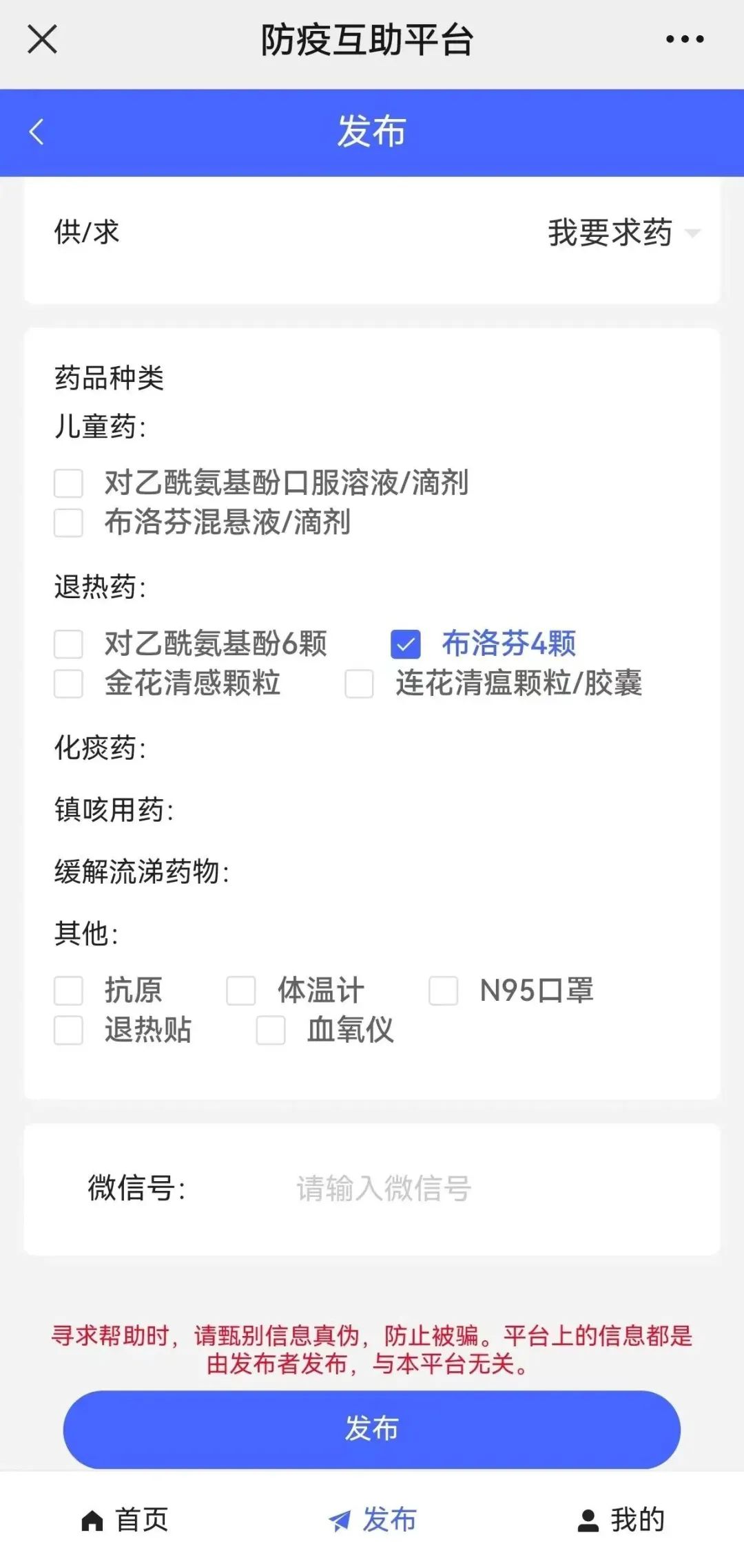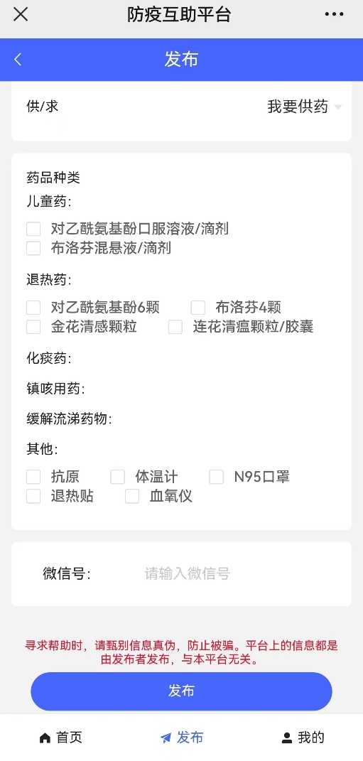 提醒:可点击最下方“发布”选项,填写地区、小区名称,选择“我要供药”并留下个人微信号来发布供药信息。
