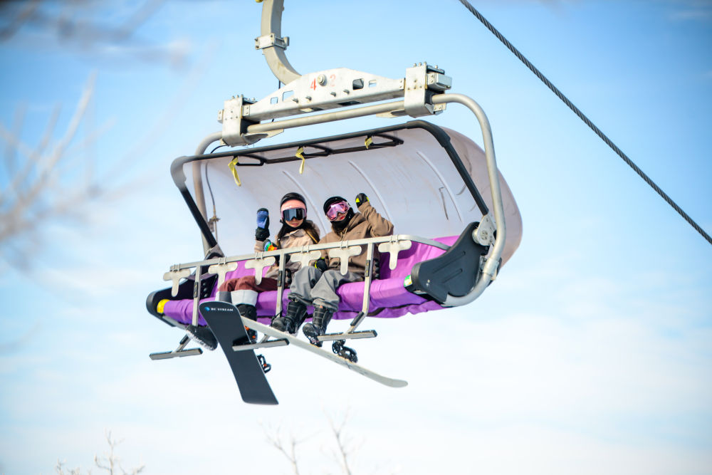 12月24日,滑雪爱好者在长春市庙香山滑雪场乘坐缆车时合影留念。新华社发(张嘉东 摄)