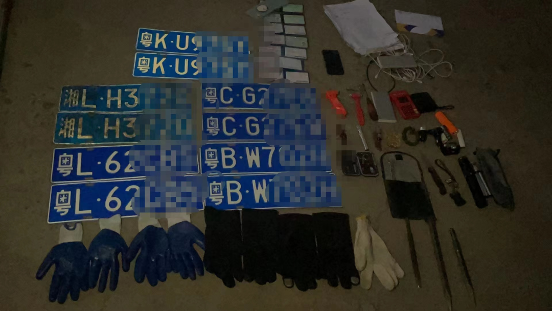 通过持续追踪,警方发现梁某等人已逃往广东化州。在掌握嫌疑人落脚点后,12月23日凌晨,专案组民警跨省追击,在化州警方协助下将梁某等4名嫌疑人抓获归案,并现场查获作案车辆以及假车牌、砸车窗工具等作案工具一批。
