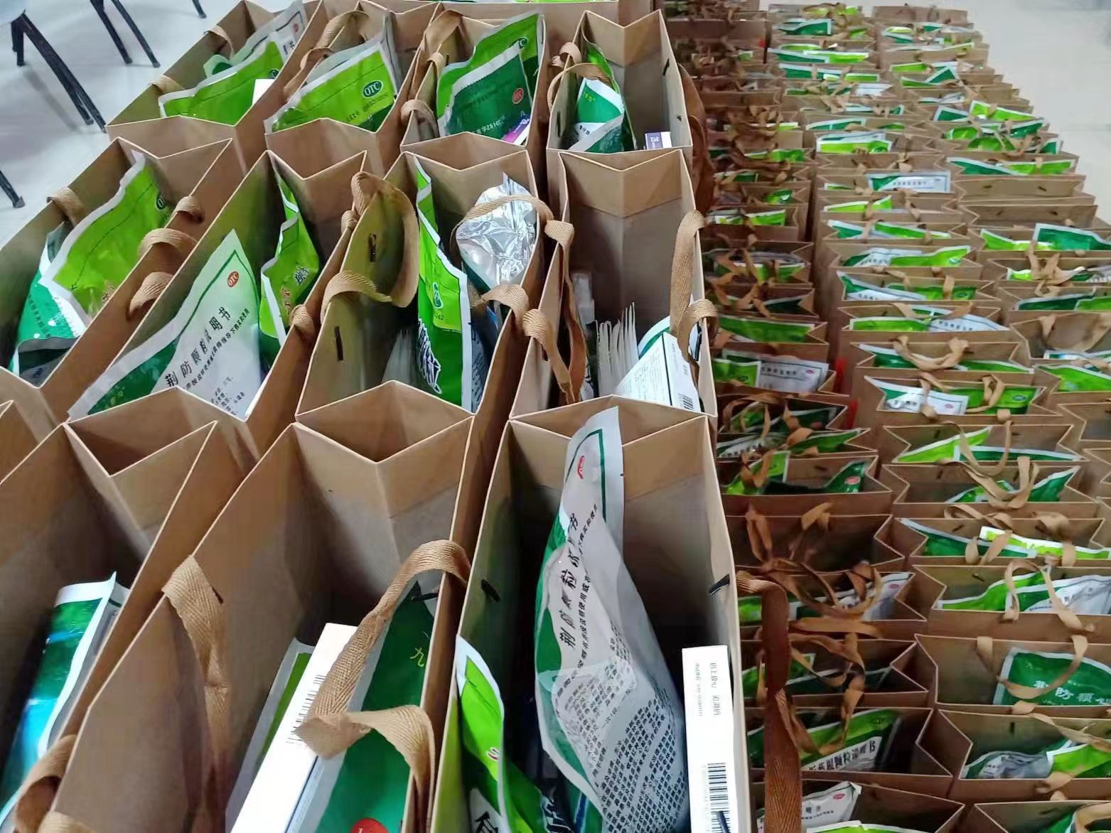 “爱心防疫健康包”内含布洛芬缓释胶囊、荆防颗粒、复方板蓝根颗粒、医用外科口罩、酒精消毒液等重点人群防疫必备的物资,并附上一份温馨提示,告知药品使用注意事项。