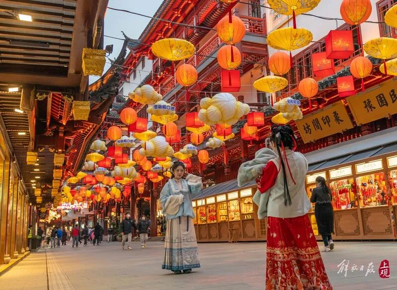 今年灯会还新增了一个仪式感满满的环节:在中心广场,每晚都会举行亮灯仪式,复刻古时上元节亮灯的盛况。待至良辰吉时,燃灯嘉宾触摸主灯组上的辉光之镜,千灯启明,整个豫园瞬间交汇成一片璀璨灯海。此外,今年的豫园灯会还运用AR技术结合实景,将灯会整个搬进元宇宙,在线上为市民游客再塑“云游山海奇豫记”。大家不仅可以线上线下AR实景互动,还能在手机屏幕上纵览“山海奇豫”。