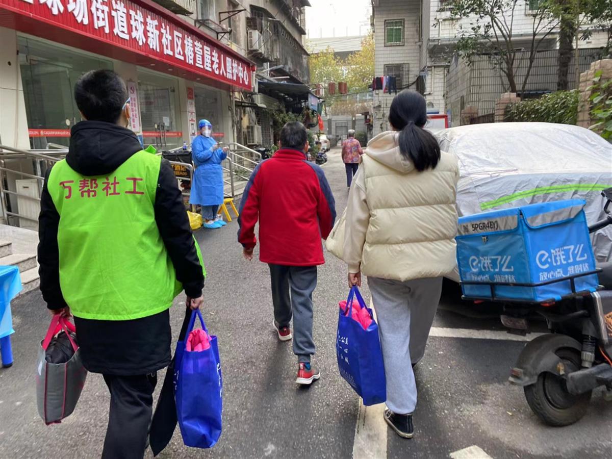 东湖高新区九峰街道社工站社工联合明畅里社区工作人员、博雅社工、志愿者,分成4个“行动小分队”,开展走访慰问关爱活动,每走访一户,赠送蔬菜包、对联、“微心愿”礼品,把关爱和温暖送到居民心中。