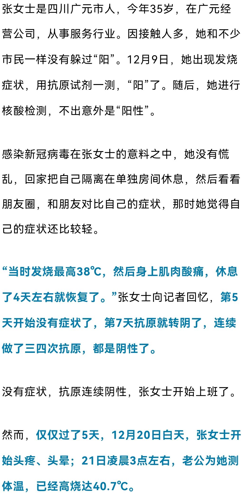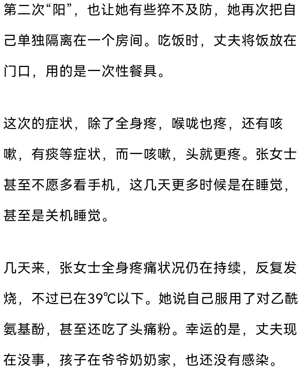 张女士告诉记者,她第一次“阳”转阴仅5天后,12月20日,她又“阳”了,且症状“比第一次疼十倍”,不仅高烧,还发冷,“浑身疼,像二锤敲,下半身除了疼没任何感觉了!”