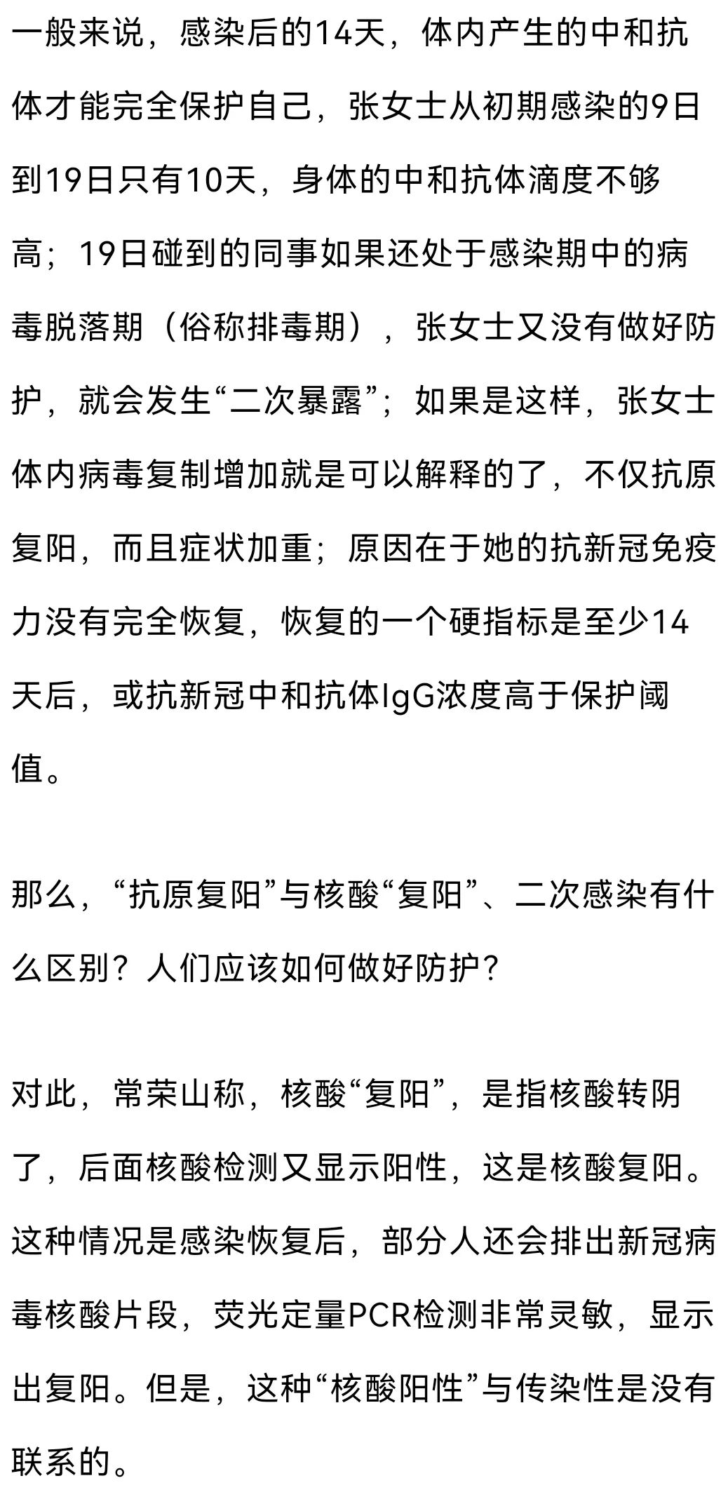 但病毒学专家常荣山解释,张女士属于“抗原复阳”。