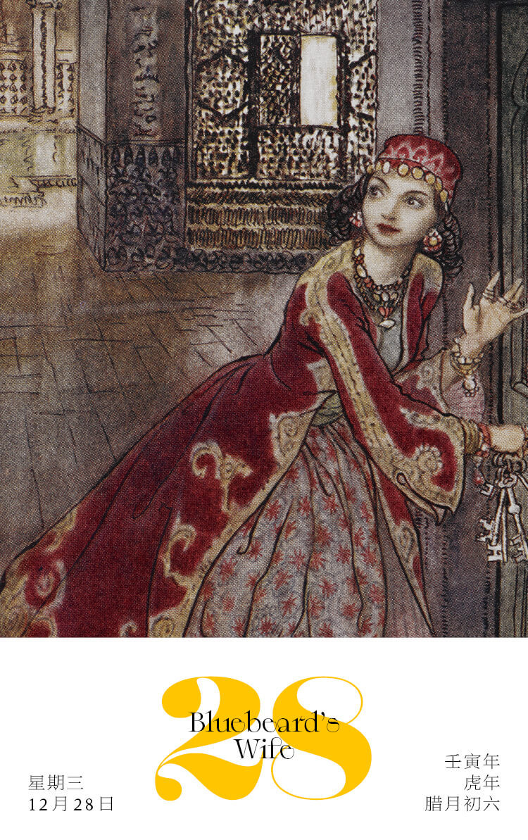 这幅插图出自1933年出版的童话书《蓝胡子》,作者是法国作家夏尔·佩罗,插图出自英国插画家亚瑟·拉克姆之手,画面描绘的是书中的女主角,蓝胡子的最后一任妻子。